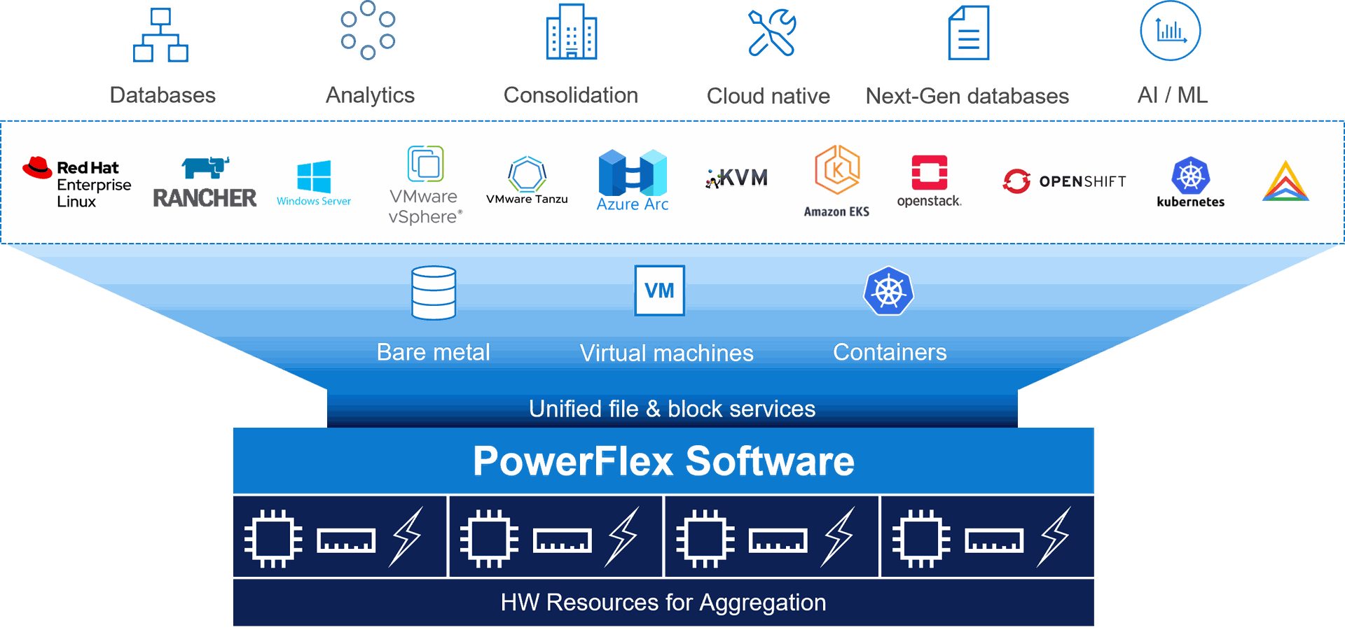 La infraestructura definida por software de PowerFlex permite una amplia consolidación en los centros de datos que abarca prácticamente cualquier tipo de carga de trabajo y topología de implementación. Su arquitectura basada en software ante todo permite la automatización y la capacidad de programación de toda la pila de infraestructura. Proporciona capacidad de ampliación, rendimiento y resiliencia para cumplir, sin esfuerzo, los SLA relevantes sobre cargas de trabajo más estrictos. Como plataforma de infraestructura universal, PowerFlex combina recursos de almacenamiento definido por software de alto rendimiento y computación en un tejido unificado y gestionado por bloques y archivos. Disponible en opciones de consumo flexibles (rack, dispositivo, nodos personalizados o en la cloud pública), permite diversas arquitecturas de implementación: computación y almacenamiento independientes (dos capas), HCI (una capa única) o una combinación de ambas cosas. PowerFlex es ideal para aplicaciones y bases de datos de alto rendimiento, para crear una cloud privada/híbrida ágil o para consolidar recursos en entornos heterogéneos.