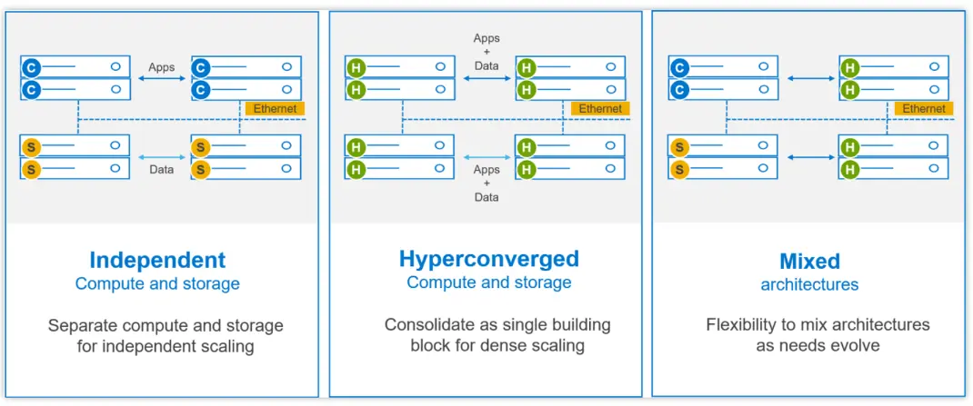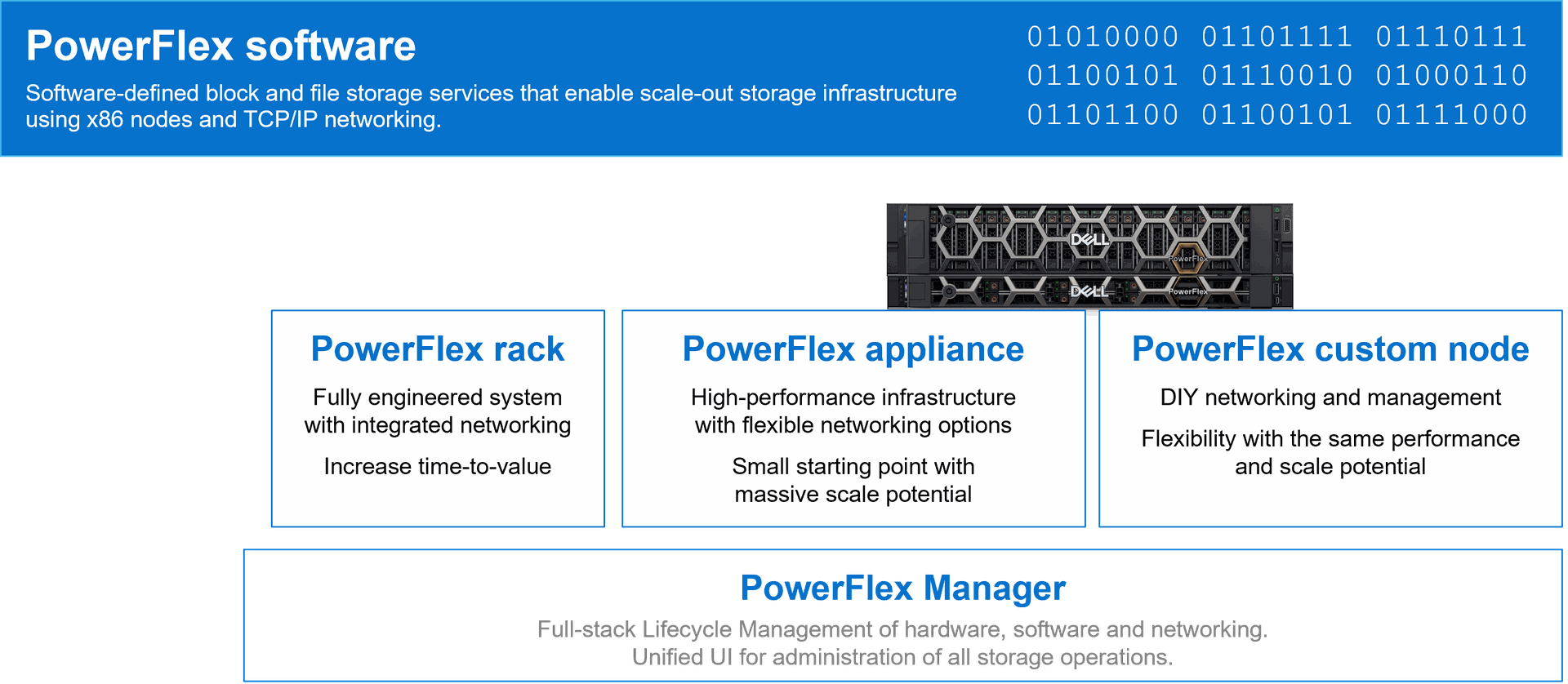 La infraestructura definida por software de PowerFlex permite una amplia consolidación en los centros de datos que abarca prácticamente cualquier tipo de carga de trabajo y topología de implementación. Su arquitectura basada en software ante todo permite la automatización y la capacidad de programación de toda la pila de infraestructura. Proporciona capacidad de ampliación, rendimiento y resiliencia para cumplir, sin esfuerzo, los SLA relevantes sobre cargas de trabajo más estrictos. Como plataforma de infraestructura universal, PowerFlex combina recursos de almacenamiento definido por software de alto rendimiento y computación en un tejido unificado y gestionado por bloques y archivos. Disponible en opciones de consumo flexibles (rack, dispositivo, nodos personalizados o en la cloud pública), permite diversas arquitecturas de implementación: computación y almacenamiento independientes (dos capas), HCI (una capa única) o una combinación de ambas cosas. PowerFlex es ideal para aplicaciones y bases de datos de alto rendimiento, para crear una cloud privada/híbrida ágil o para consolidar recursos en entornos heterogéneos.